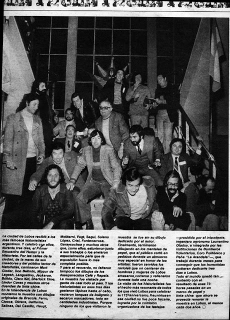 Éramos tan jóvenes... Un grupo de estudiantes del Instituto de Directores de Arte, IDA, nos fuimos de campamento a San Antonio de Areco mietnras se disputaba el primer partido del Mundial en Buenos Aires. Al regresar, nos fuimos metiendo en el clima triunfalista, partido a partido. La ciudad estaba invadida de hinchas extranjeros.En el mismo número de la revista Gente en que se anunciaba el comienzo del Mundial, salía esta foto del reciente Primer Encuentro del Humor y la Historieta realizado en Lobos: Caloi, Macagno, Aldo Rivero, Cedrés, Seguí, Bróccoli, Ibáñez, Ferro, Rep, Trigo, Pedrazzzini, Pergament, Lucho Olivera; abajo: Massaroli, Marchionne, Mandrafina y el francés Mechain